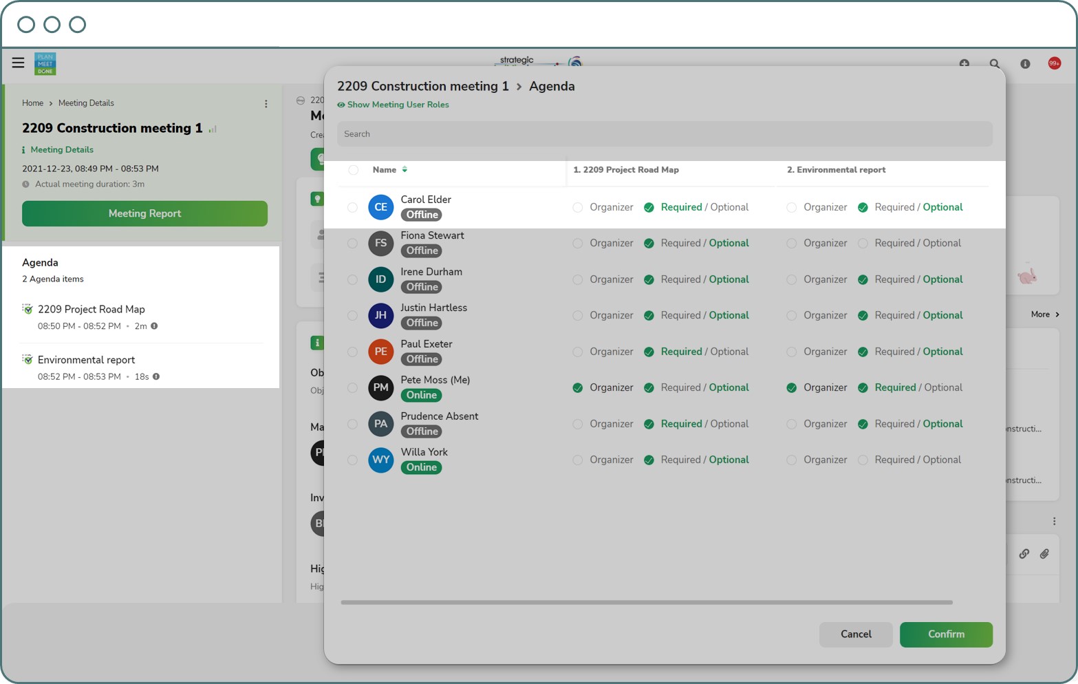 Avoid blocking everybody’s time for an entire meeting by planning agenda and inviting specific topic contributors. PMD maintains integration of agenda topics and meeting participation requirements for attendees to enable them to plan and use their time more productively.