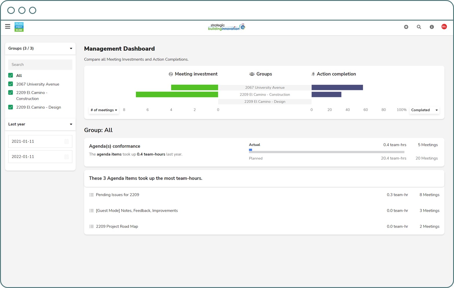 Set visible agenda goals for schedule adherence and commitment reliability to challenge the team. PMD quickly accesses and filters meeting dashboards for performance metrics such as agenda topic schedule adherence and action item completion rates.